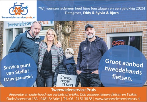Mijn naam is Eddy Pruis en sta links op de foto. 16 jaar lang ben ik bedrijfsleider geweest in een fietsenwinkel. In 2010 ben ik samen met mijn vrouw (Sylvia) een mobiele fietswerkplaats begonnen. Het werk nam in de loop der jaren toe! Ik en onze monteur reden met 2 mobilewerkplaatsen door de provincie. Inmiddels hebben we alweer jaren een winkel/servicepunt in het plaatsje Vries (Dr).